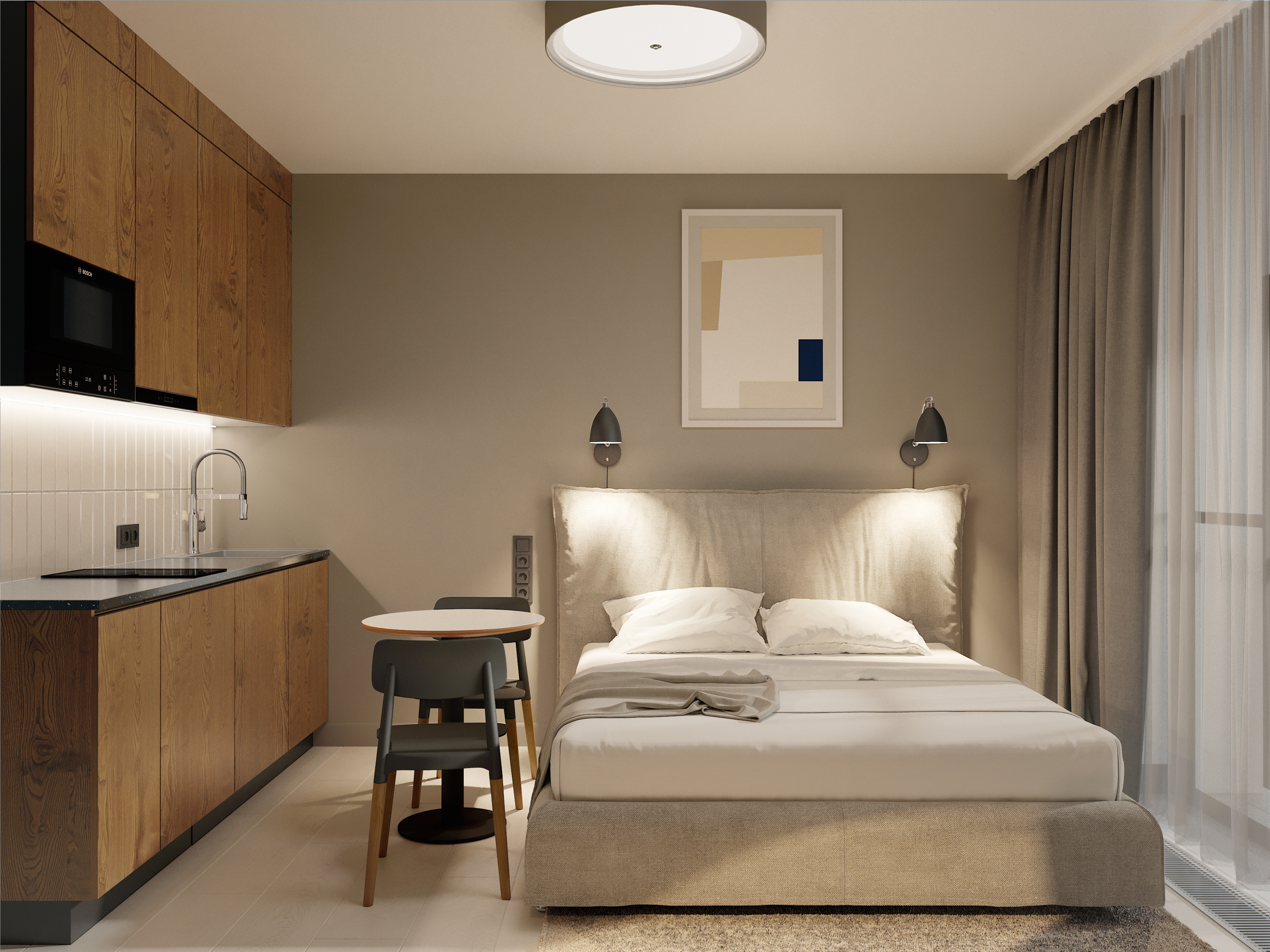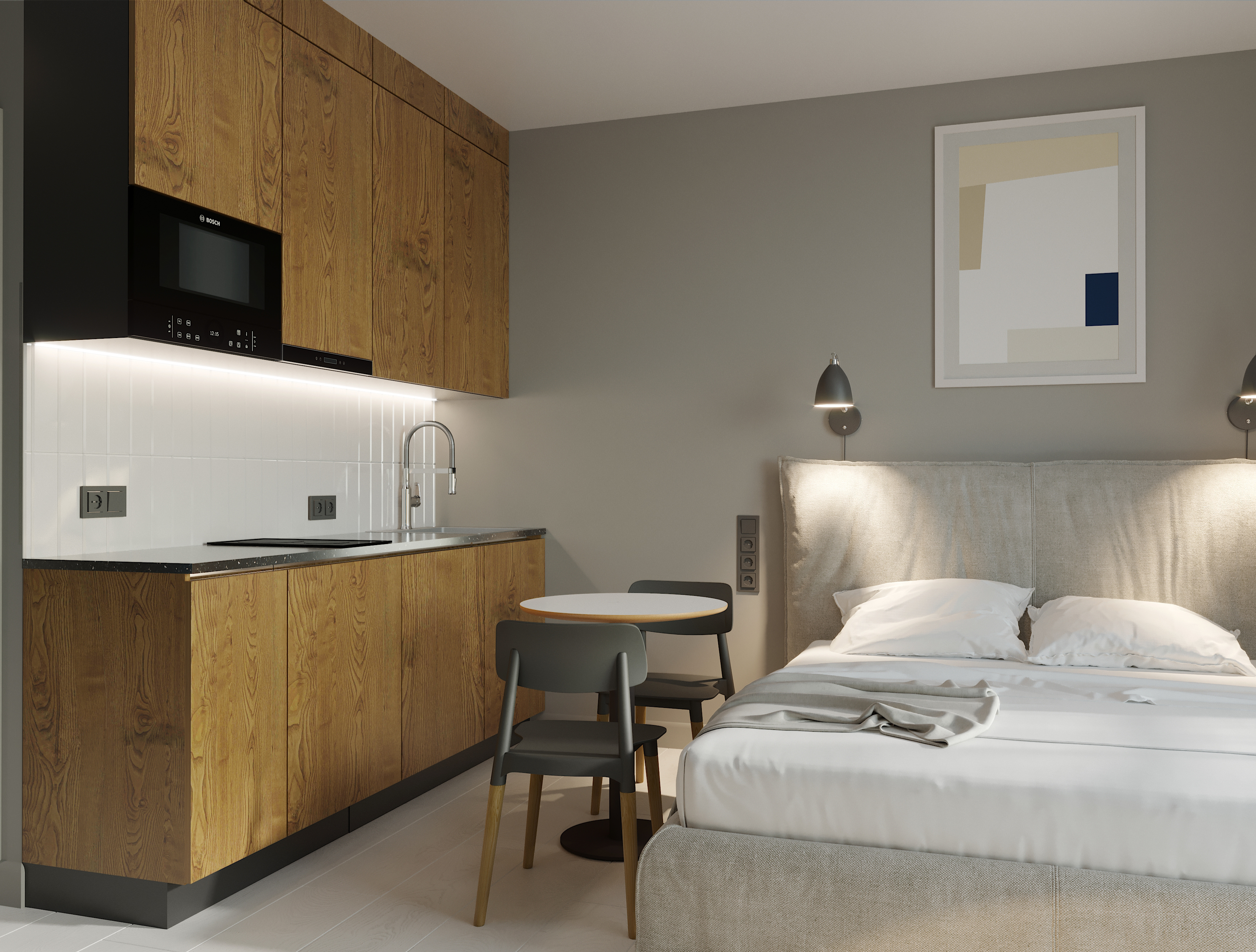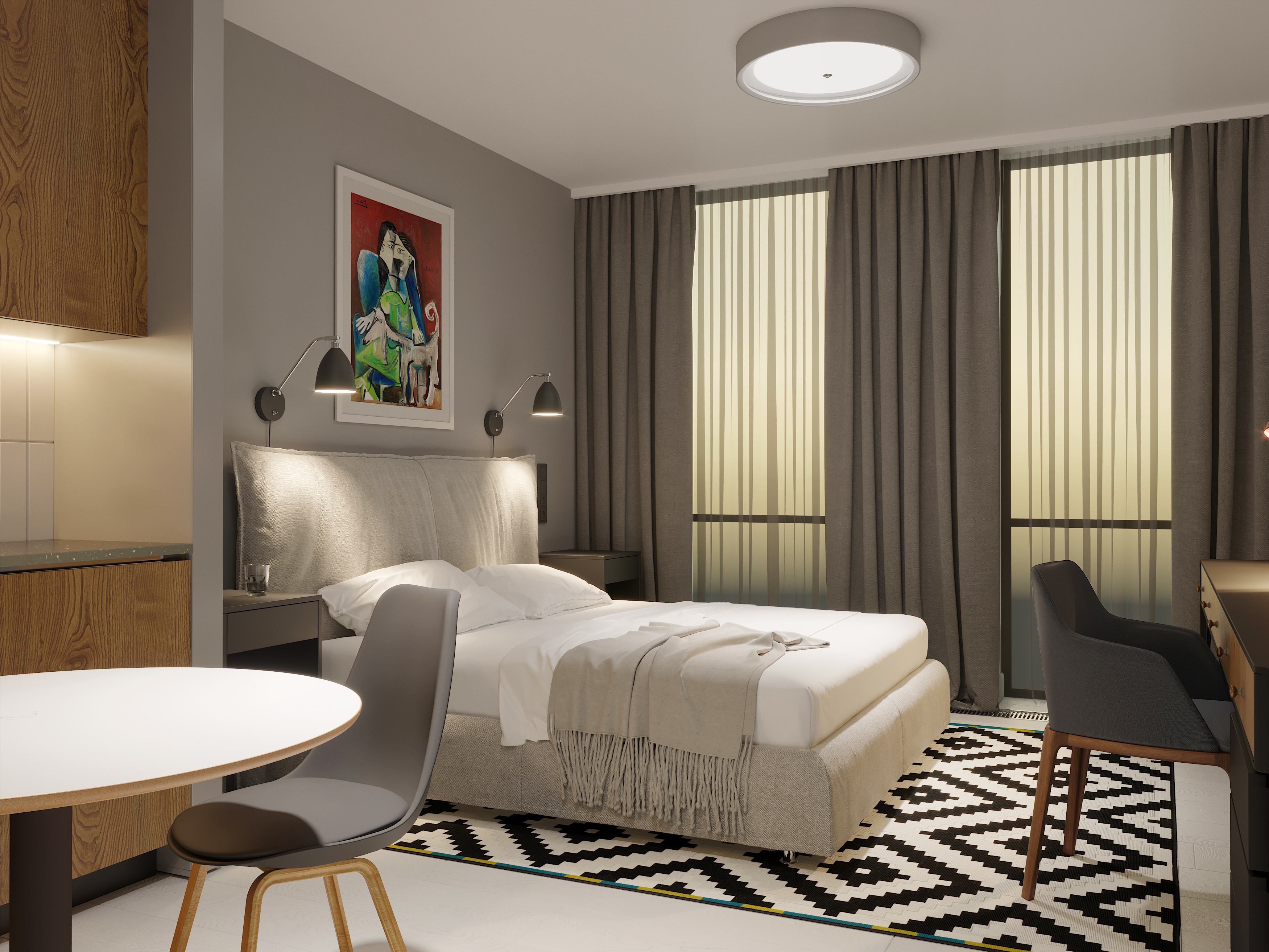 Комплекс возведен по монолитной технологии строительства с применением вентилируемых фасадов и панорамного остекления. Все апартаменты сдаются с чистовой отделкой, меблировкой и оснащением. Отделка выполнена из высокопрочных материалов с соответствующим уровнем износостойкости и влагостойкости, что необходимо для постоянной сдачи в аренду при частой смене гостей.