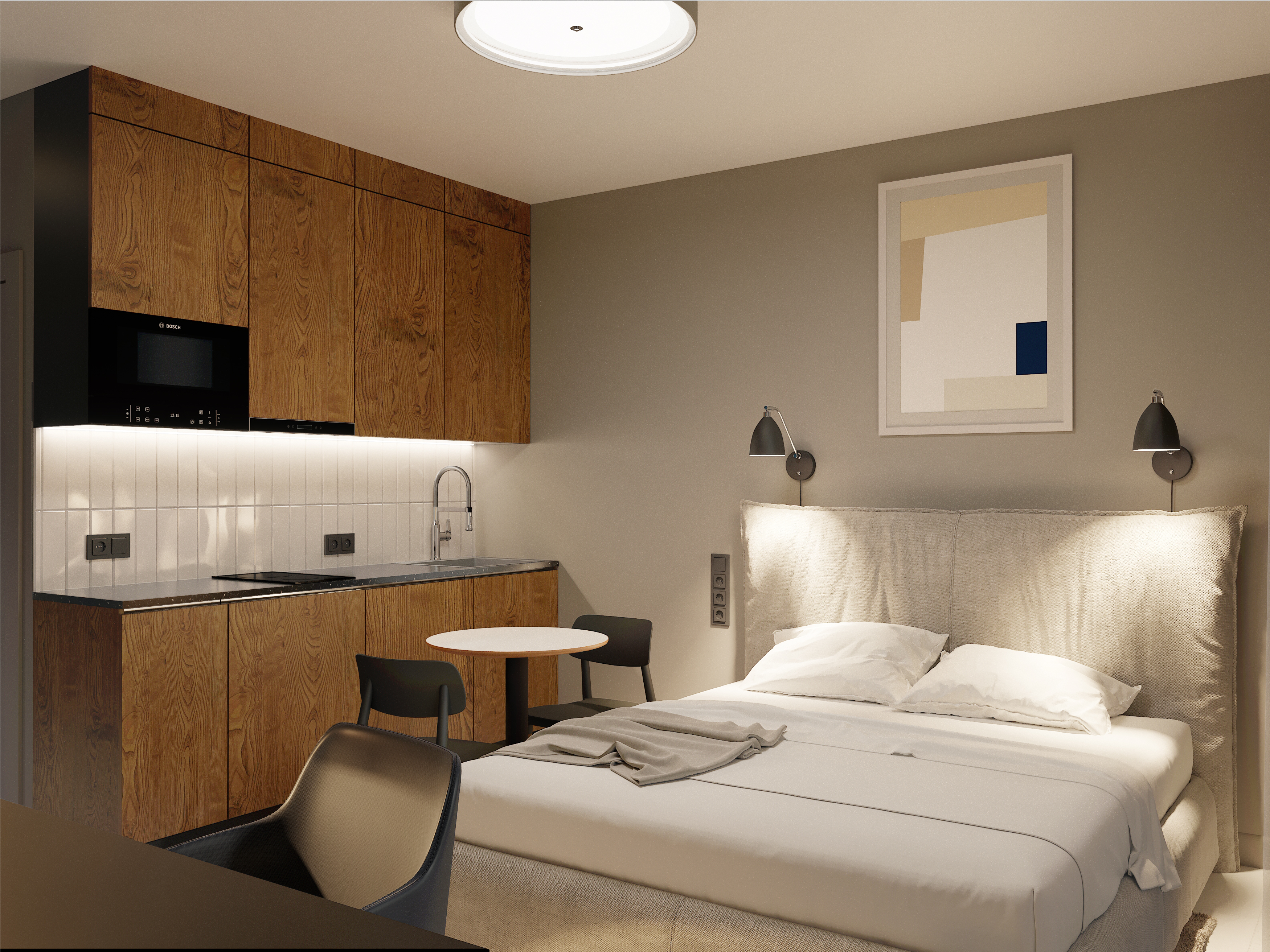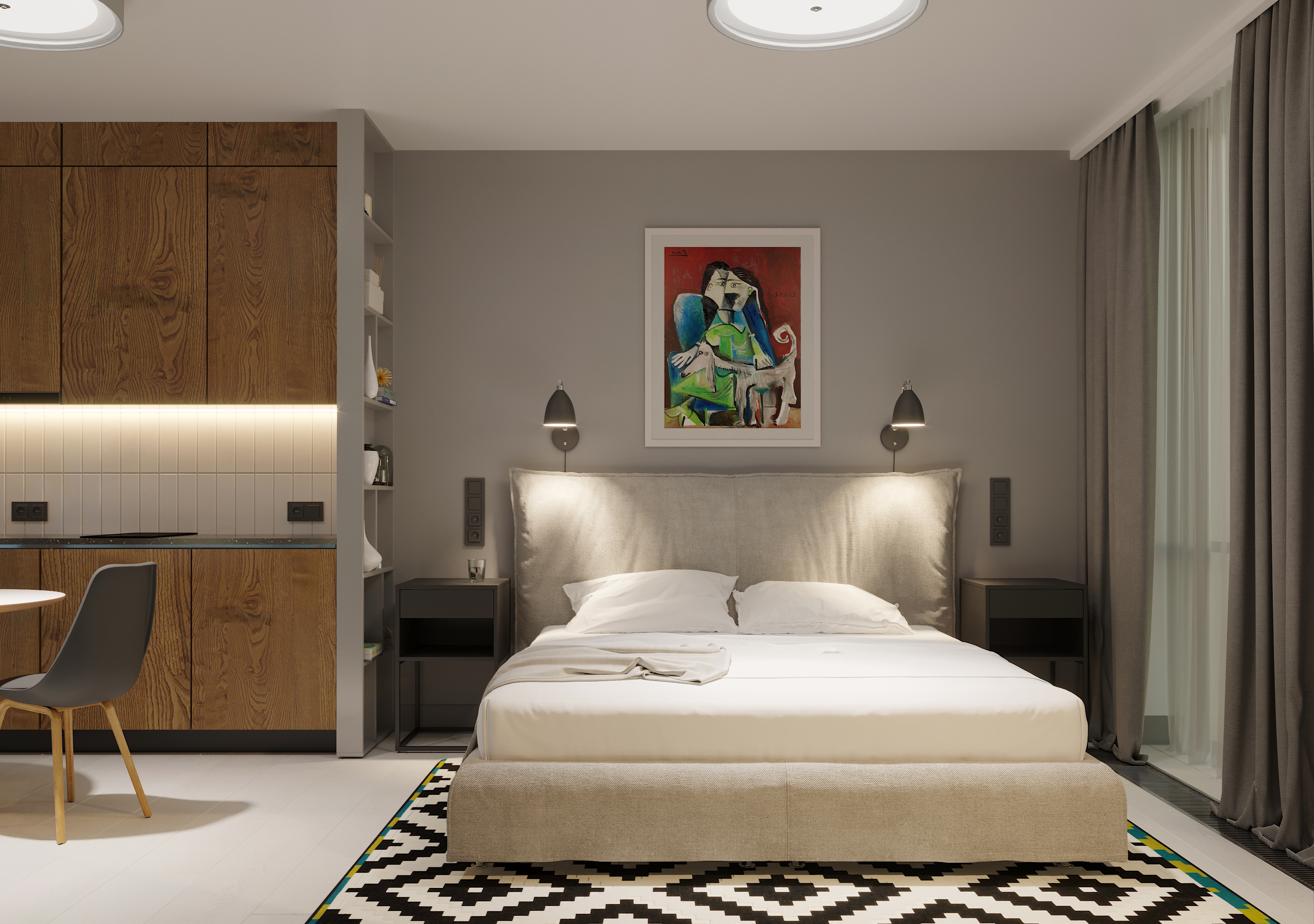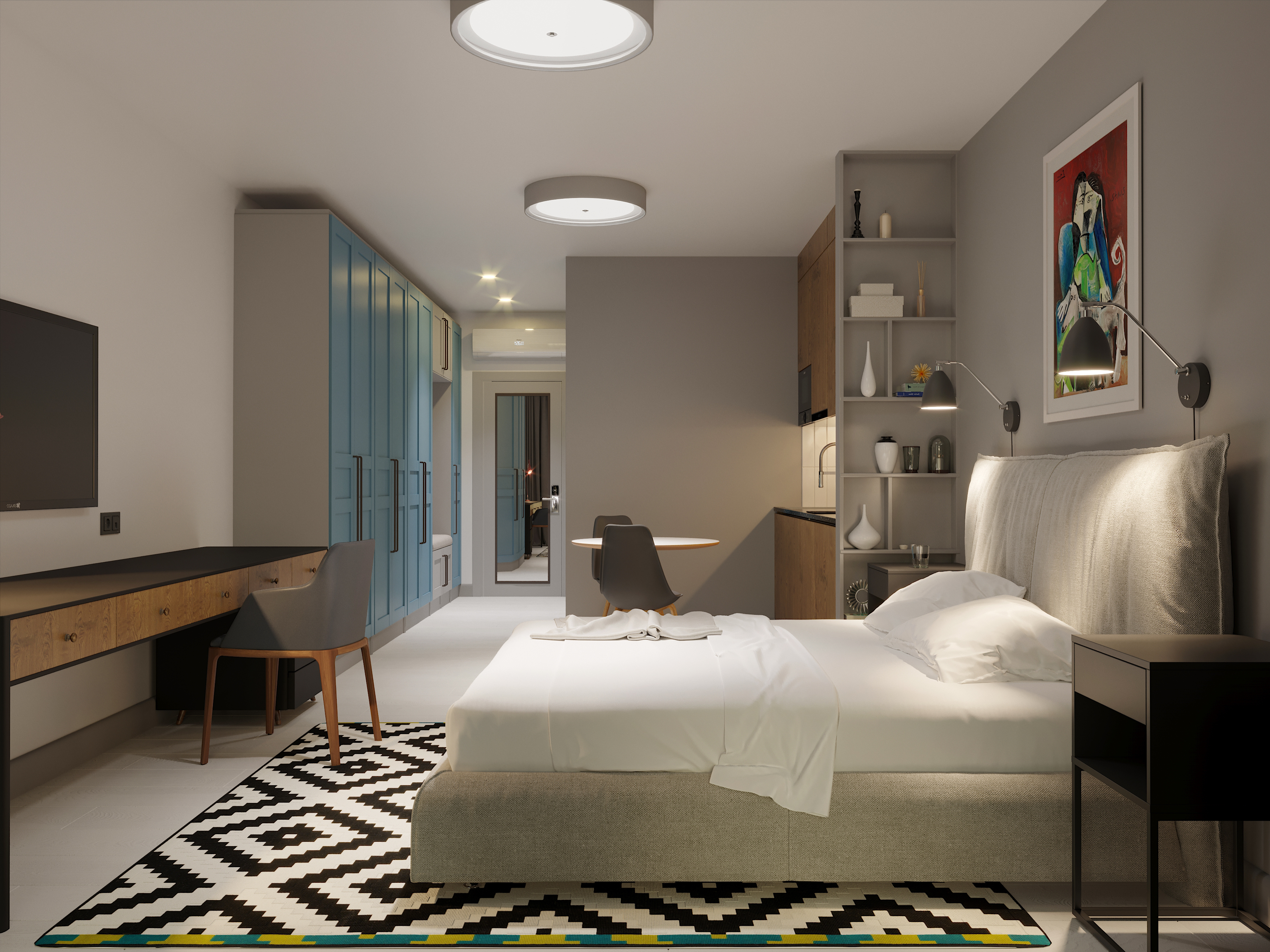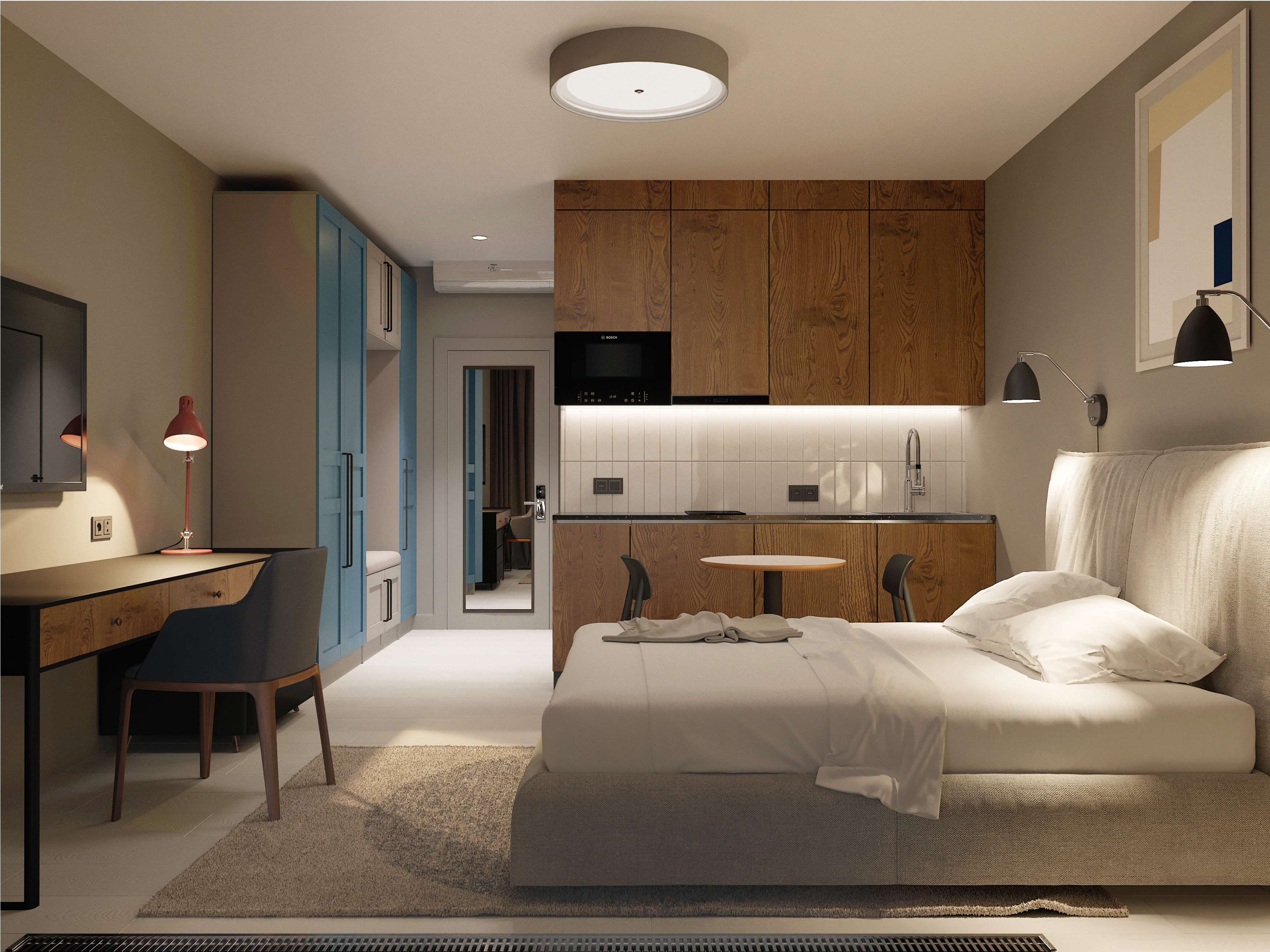 Комплекс возведен по монолитной технологии строительства с применением вентилируемых фасадов и панорамного остекления. Все апартаменты сдаются с чистовой отделкой, меблировкой и оснащением. Отделка выполнена из высокопрочных материалов с соответствующим уровнем износостойкости и влагостойкости, что необходимо для постоянной сдачи в аренду при частой смене гостей.